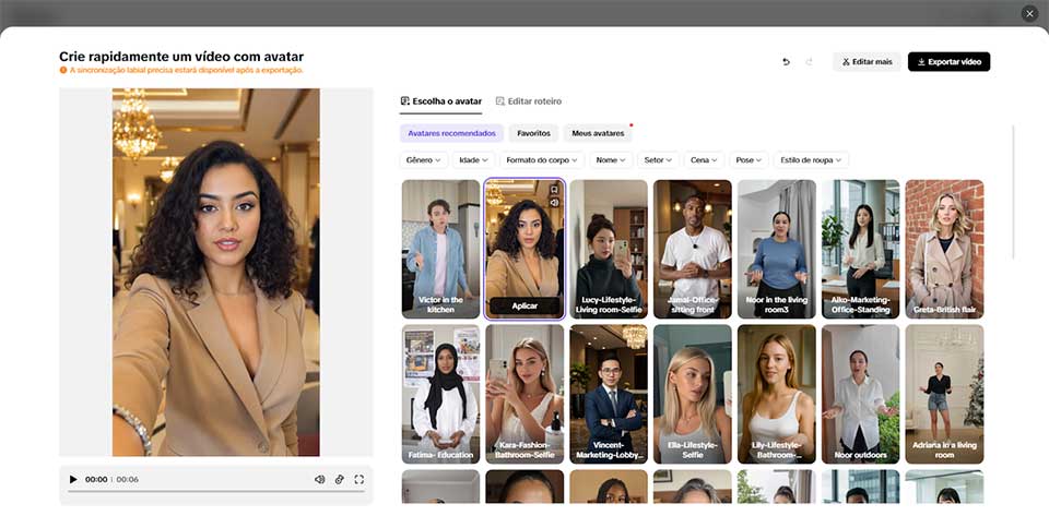 O segundo passo é selecionar um avatar na lista de "Avatares recomendados". Você pode filtrar por gênero, idade, setor e outros critérios, para encontrar o encaixe ideal para sua campanha.