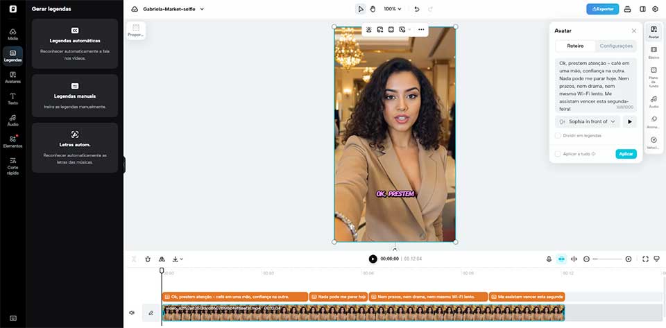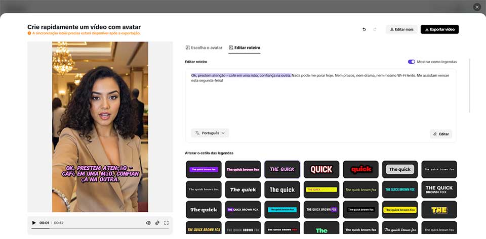 Depois de escolher, clique no botão "Editar roteiro" e escreva o seu próprio diálogo. É possível digitar em vários idiomas, e o avatar fará a leitura labial com precisão. Para intensificar o efeito, role até "Alterar estilo de legenda" e selecione os designs que realcem o tom da sua marca, tornando o vídeo ainda mais atrativo.