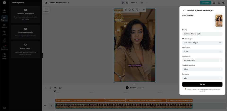 Após finalizar, clique em "Exportar" para salvar seu vídeo no formato desejado. Para alcance instantâneo, use a opção "Publicar" para postar no TikTok, Instagram ou Facebook. Também é possível agendar postagens e acompanhar o desempenho pelo painel de Analytics, otimizando campanhas futuras.