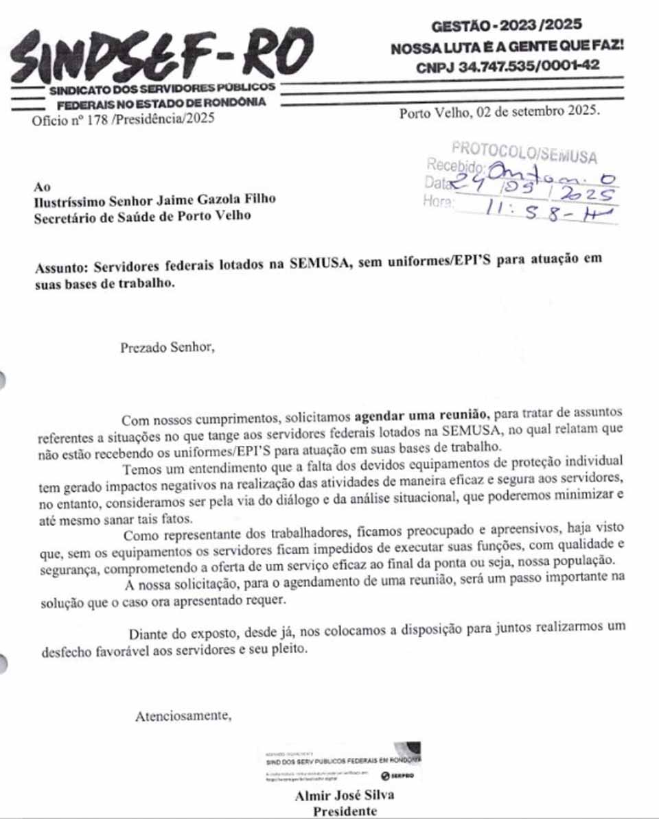 Com a mudança na gestão e a chegada do secretário Jaime Gazola Filho, o Sindsef/RO intensificou a pressão. Através do Ofício nº 178/Presidência/2025, a entidade relatou o histórico de descaso e exigiu uma reunião imediata para sanar as irregularidades.