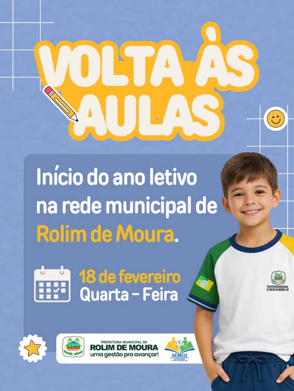 A Prefeitura de Rolim de Moura, por meio da SEMED, informa que o ano letivo da rede municipal de ensino terá início no dia 18 de fevereiro (quarta-feira).