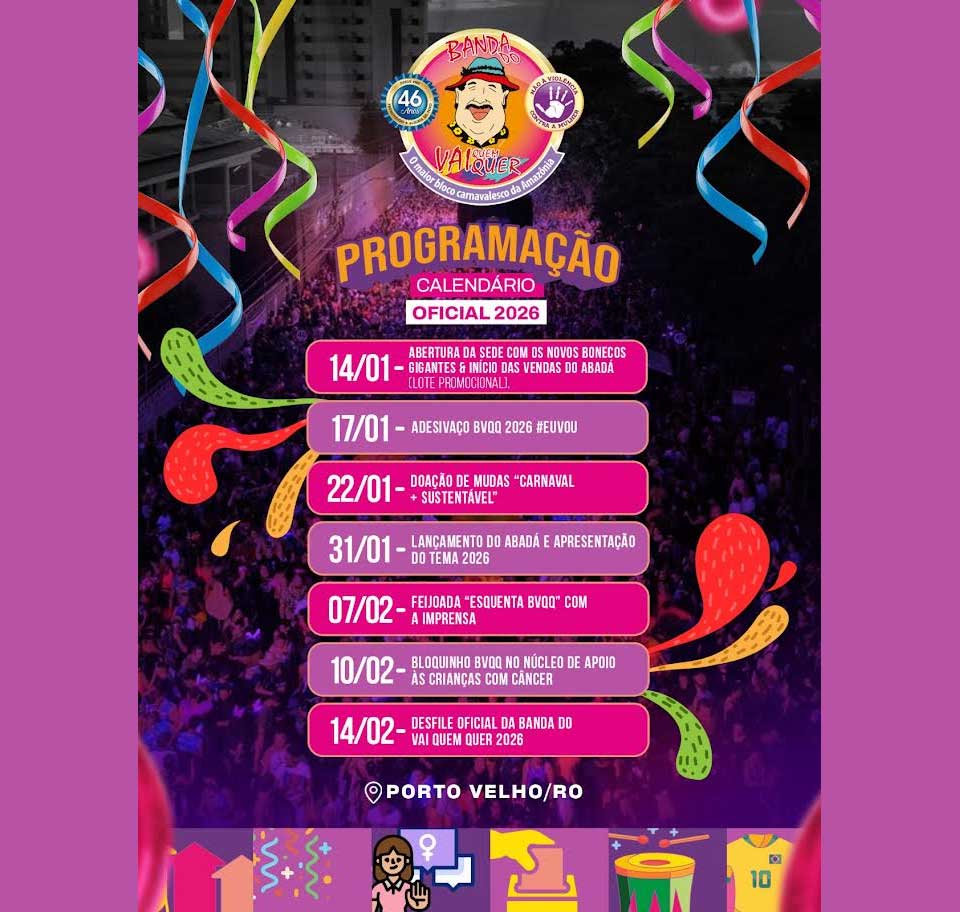 A diretoria da Banda do Vai Quem Quer (BVQQ), o maior bloco carnavalesco da região Norte, anunciou oficialmente nesta semana a programação para a temporada de 2026. Comemorando 46 anos de história e resistência cultural, o cronograma que une festa, solidariedade e sustentabilidade abre alas.