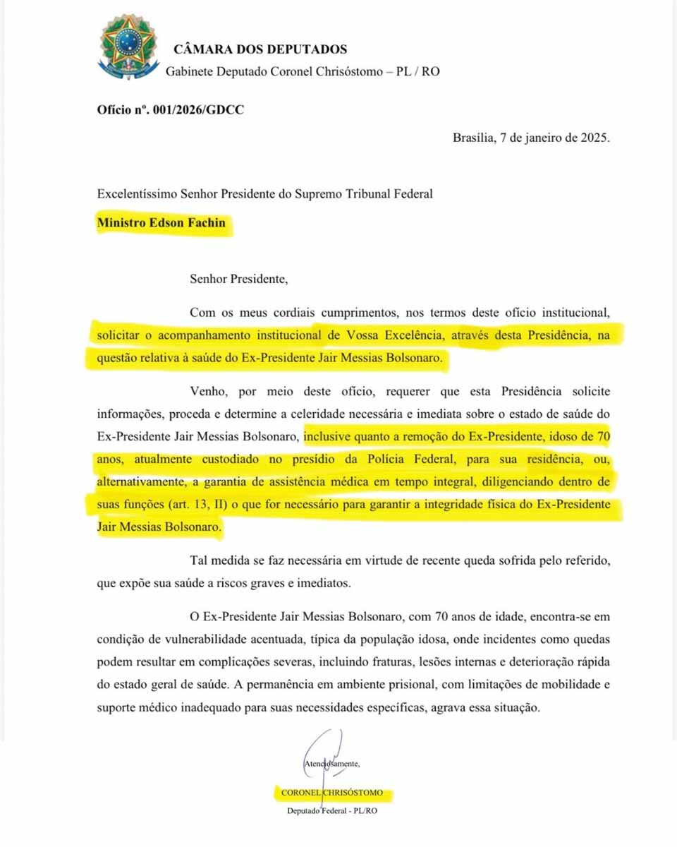 O deputado federal Coronel Chrisóstomo (PL-RO) encaminhou ofício ao presidente do Supremo Tribunal Federal (STF), ministro Edson Fachin, solicitando providências relacionadas à situação de saúde do ex-presidente Jair Messias Bolsonaro, atualmente custodiado em unidade da Polícia Federal. O documento, de caráter institucional, foi datado de 7 de janeiro de 2025 e registrado sob o número 001/2026/GDCC, no gabinete do parlamentar.