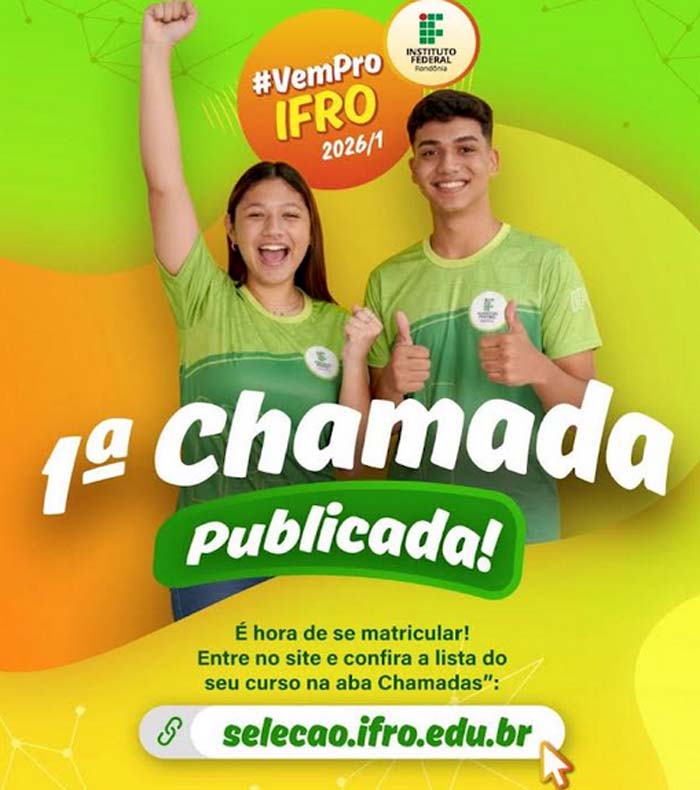 O Instituto Federal de Educação, Ciência e Tecnologia de Rondônia (IFRO) publicou as listas do Processo Seletivo Unificado (PSU/IFRO 2026/1) com os candidatos convocados em 1ª chamada. O prazo para os convocados realizarem a matrícula está aberto até a próxima segunda-feira (12). O processo de matrícula é todo de forma on-line, cumprindo as etapas previstas no edital e observando rigorosamente os prazos estabelecidos no cronograma.