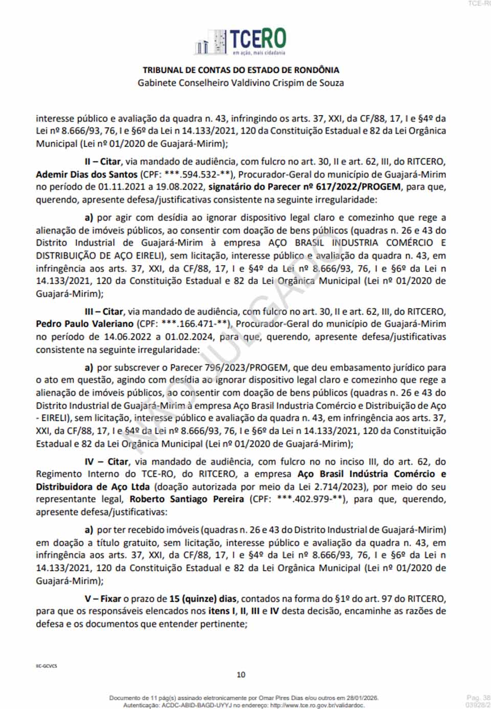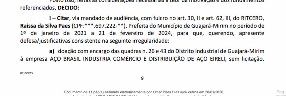 O caso foi instaurado a partir de representação do Ministério Público de Contas (MPC), que aponta supostas ilegalidades na doação de imóveis públicos à empresa Aço Brasil Indústria Comércio e Distribuidora de Aço Ltda. Segundo os autos, a apuração envolve a ausência de licitação, a falta de avaliação prévia completa das áreas doadas e a inexistência de justificativa formal do interesse público. Foram citados para apresentar defesa, no prazo de 15 dias, a ex-prefeita de Guajará-Mirim Raíssa da Silva Paes, conhecida como Raíssa Bento, que esteve à frente do município entre 1º de janeiro de 2021 e 21 de fevereiro de 2024, além dos então procuradores-gerais do município Ademir Dias dos Santos e Pedro Paulo Valeriano. A empresa Aço Brasil também foi chamada a se manifestar, por meio de seu representante legal, Roberto Santiago Pereira. O Tribunal advertiu que a ausência de resposta pode levar à revelia, conforme o regimento interno da Corte.
