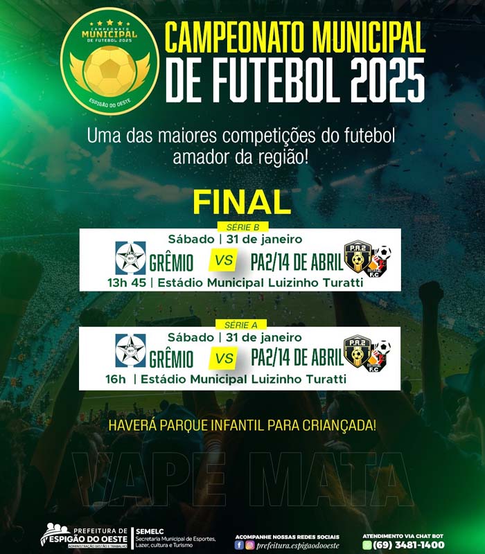 O Estádio Municipal Luizinho Turatti será palco, neste sábado, 31 de janeiro, das finais do Campeonato Municipal de Futebol 2025, competição que reúne equipes locais e atletas de diferentes municípios e se consolidou como uma das principais disputas públicas de futebol amador da região. A programação prevê a decisão da Série B às 13h45 e da Série A às 16h, além de cerimônia oficial de encerramento marcada para as 15h45.