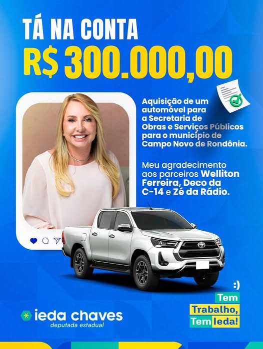 A deputada também registrou agradecimentos a lideranças políticas e comunitárias que atuam em Campo Novo de Rondônia, citando Welliton Ferreira, Deco da C-14 e Zé da Rádio, apontados como parceiros no diálogo institucional e nas articulações em prol do desenvolvimento do município. A atuação conjunta, de acordo com o contexto apresentado, tem sido voltada à identificação de demandas e à busca por soluções para a cidade.