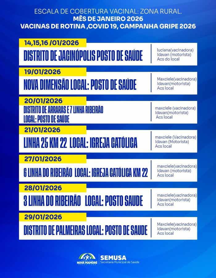 As ações começarão pelo distrito de Jacinópolis, onde o posto de saúde receberá a equipe de vacinação nos dias 14, 15 e 16 de janeiro. Na sequência, o atendimento será levado à localidade de Nova Dimensão no dia 19, seguido pelo distrito de Araras, na região da E7 Linha Ribeirão, no dia 20. A programação avança no dia 21 com vacinação na Linha 25, Km 22, em espaço cedido pela Igreja Católica.