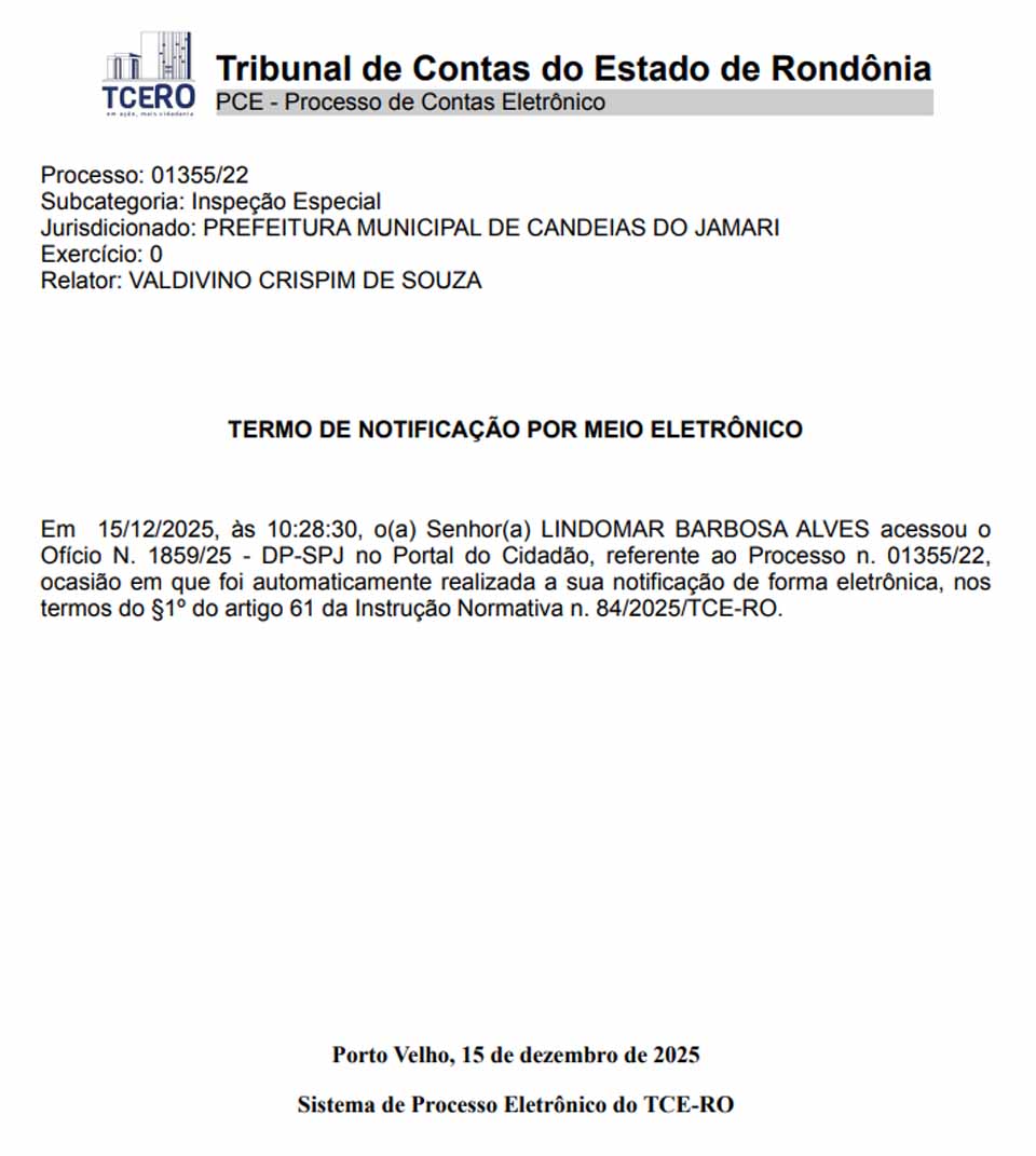Ao final da tramitação, o Tribunal registrou que o prefeito Lindomar Barbosa Alves tomou ciência formal da decisão por meio eletrônico. Conforme anotação do sistema do TCE-RO, o gestor acessou, em 15 de dezembro de 2025, o ofício expedido no processo por meio do Portal do Cidadão, o que caracterizou a notificação eletrônica automática, nos termos da norma interna que regula as comunicações processuais da Corte de Contas.
