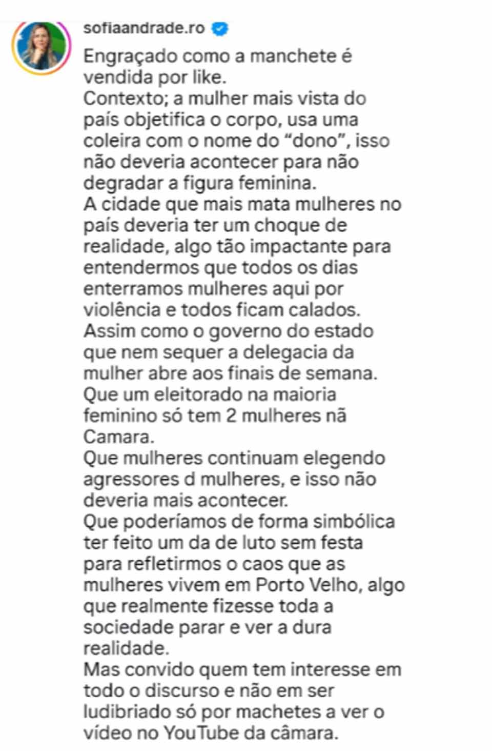 No mesmo comentário, a vereadora voltou a relacionar o debate cultural à realidade local de violência contra mulheres. Ela mencionou que Porto Velho estaria entre as cidades com altos índices de homicídios femininos e defendeu que o cenário exigiria ações simbólicas e institucionais mais contundentes. “A cidade que mais mata mulheres no país deveria ter um choque de realidade, algo tão impactante para entendermos que todos os dias enterramos mulheres aqui por violência e todos ficam calados”, afirmou.