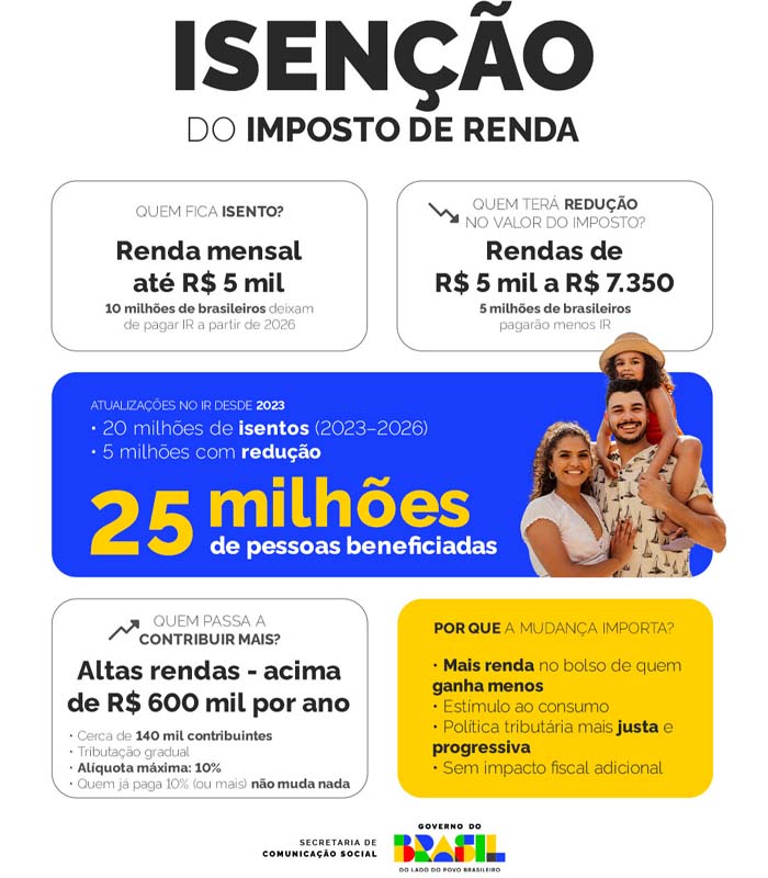 25 MILHÕES — O Governo do Brasil já havia reajustado a tabela do IR em 2023 e 2024, dando fim a um ciclo de mais de seis anos de defasagem. Com isso, entre 2023 e 2026, a isenção total chega a 20 milhões de brasileiros e a redução do imposto pago beneficia outros 5 milhões. Um total de 25 milhões de contemplados desde o início da atual gestão.