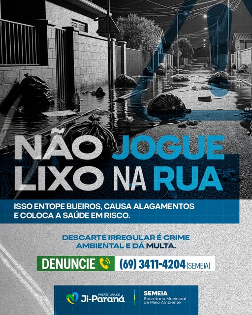 Uma orientação voltada à população foi reforçada pela Prefeitura de Ji-Paraná para coibir o descarte de lixo em vias públicas. Segundo o comunicado, o hábito é apontado como fator que contribui para o entupimento de bueiros, situação que favorece a ocorrência de alagamentos e amplia a exposição a doenças, com impacto direto na saúde coletiva.