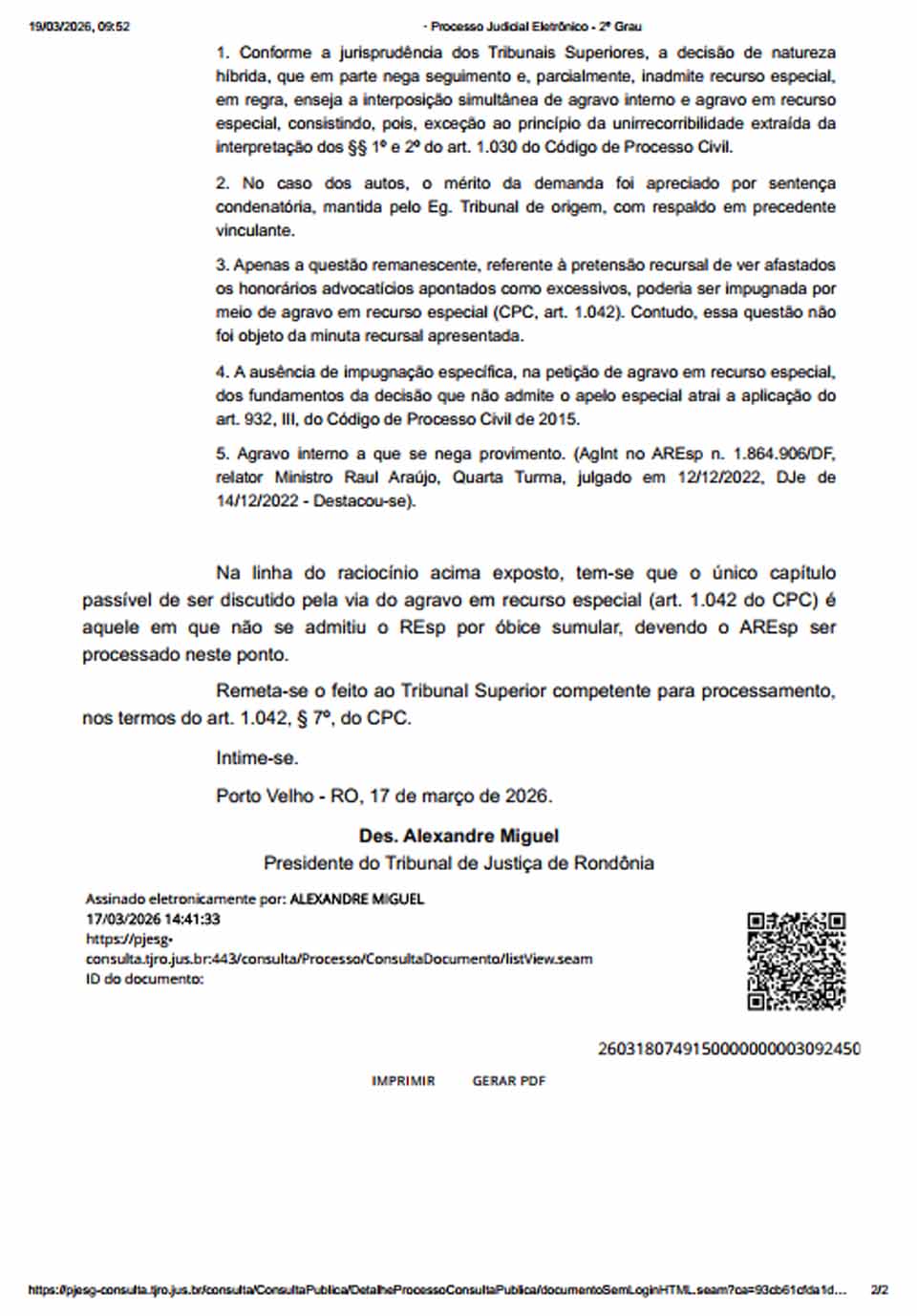 O ponto que seguirá ao Superior Tribunal de Justiça é restrito a uma questão processual: a Corte vai analisar se foi correta a decisão do TJRO que barrou parte do recurso especial com base em entendimento sumulado. Esse exame ocorre por meio de agravo em recurso especial e não reabre, neste momento, o mérito da ação, como a discussão sobre a existência de dolo ou a própria condenação por improbidade, já mantidas no âmbito estadual.