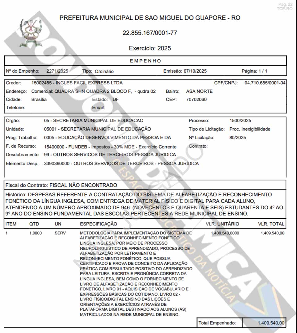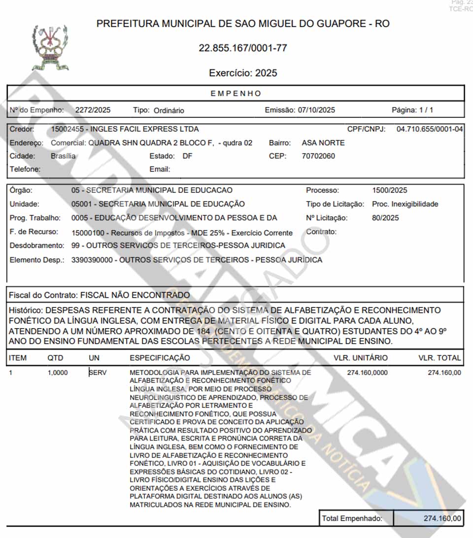 Os documentos de empenho juntados ao processo mostram que a contratação foi registrada em duas despesas emitidas no mesmo dia, 7 de outubro de 2025, ambas por inexigibilidade. O empenho nº 2271/2025 foi lançado no valor de R$ 1.409.540,00 para atendimento aproximado de 946 estudantes do 4º ao 9º ano do ensino fundamental. O empenho nº 2272/2025 foi lançado no valor de R$ 274.160,00 para atendimento aproximado de 184 estudantes das mesmas séries. Nos dois casos, a credora indicada é a empresa Inglês Fácil Express Ltda., inscrita no CNPJ nº 04.710.655/0001-04, com endereço em Brasília. Os registros descrevem a contratação de sistema de alfabetização e reconhecimento fonético da língua inglesa, com entrega de material físico e digital para cada aluno, incluindo livros, conteúdo em plataforma digital e metodologia voltada à leitura, escrita e pronúncia da língua inglesa. Nos dois empenhos consta ainda a informação de que o fiscal do contrato não foi encontrado.