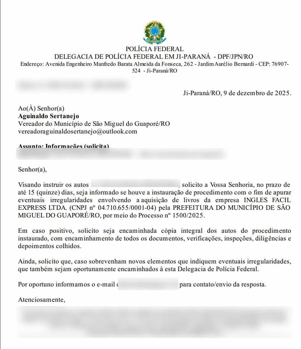 PORTO VELHO, RO - A Delegacia da Polícia Federal em Ji-Paraná enviou, em 9 de dezembro de 2025, um ofício ao vereador Aguinaldo Sertanejo, de São Miguel do Guaporé, para saber se havia algum procedimento instaurado para apurar eventuais irregularidades na aquisição de livros da empresa Inglês Fácil Express Ltda. pela Prefeitura, no Processo nº 1500/2025. No documento, assinado pelo delegado Danilo Felix de Mattos, a PF fixou prazo de até 15 dias para resposta e solicitou que, se existisse essa apuração no Legislativo municipal, fossem encaminhadas cópias integrais dos autos, com documentos, verificações, diligências, inspeções e depoimentos já reunidos.O Rondônia Dinâmica tentou contato com Aguinaldo Sertanejo, mas não obteve êxito. O espaço está aberto ao edil para que responda se houve resposta ao pedido da PF ou não.