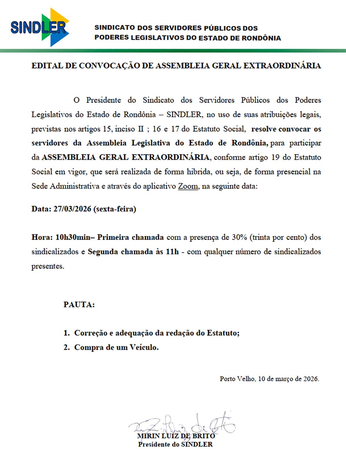 O Sindicato dos Servidores Públicos dos Poderes Legislativos do Estado de Rondônia (SINDLER) publicou edital de convocação para Assembleia Geral Extraordinária destinada aos servidores da Assembleia Legislativa de Rondônia. A reunião será realizada no dia 27 de março de 2026, em formato híbrido, com participação presencial na sede administrativa do sindicato e também por meio da plataforma Zoom. A primeira chamada está prevista para as 10h30, com quórum mínimo de 30% dos sindicalizados, e a segunda chamada às 11h, com qualquer número de participantes. Na pauta constam a correção e adequação da redação do Estatuto da entidade e a deliberação sobre a compra de um veículo.