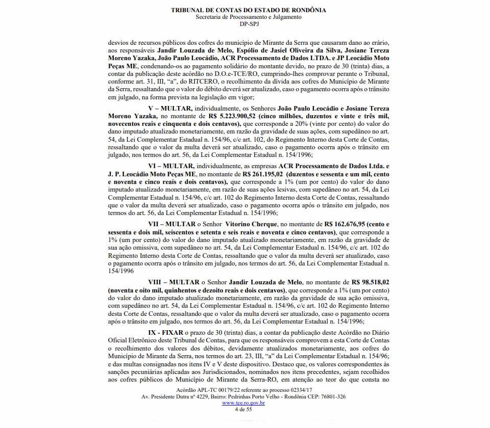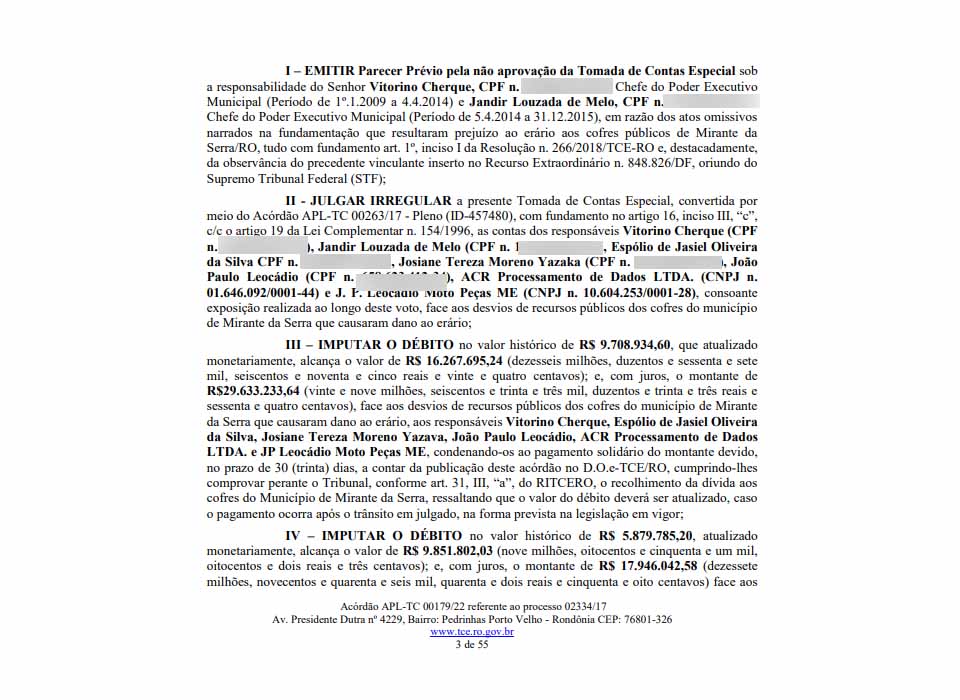 O Acórdão APL-TC 00179/22, contestado na ação, julgou irregular a Tomada de Contas Especial instaurada para apurar desvios de recursos públicos ocorridos entre 2011 e 2015 no âmbito do Poder Executivo de Mirante da Serra. O Tribunal de Contas imputou débitos milionários aos responsáveis, determinou o pagamento solidário dos valores ao município, aplicou multas individuais e declarou a inabilitação de agentes para o exercício de cargo em comissão ou função de confiança, além de fixar prazos para recolhimento das quantias.