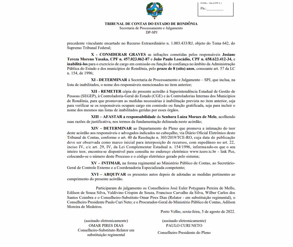 Eles também pediram, em caráter liminar, a suspensão das execuções fiscais de números 7000021-50.2023.8.22.0004, 7002727-06.2023.8.22.0004, 7002729-73.2023.8.22.0004 e 7000018-95.2023.8.22.0004, que tiveram origem no acórdão do Tribunal de Contas. A tutela de urgência foi inicialmente concedida, com suspensão das execuções, e foi deferida a gratuidade da justiça.