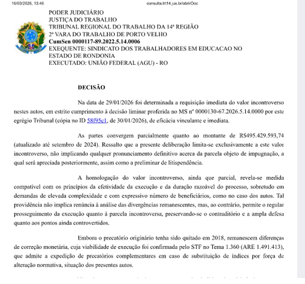 Em decisão proferida em 16 de março de 2026, a 2ª Vara do Trabalho de Porto Velho, vinculada ao Tribunal Regional do Trabalho da 14ª Região (TRT-14), homologou parcialmente o valor de R$ 482.975.764,29 como base para expedição de precatórios complementares destinados a servidores da educação de Rondônia. A medida, que cumpre liminar de mandado de segurança do próprio tribunal, acelera o pagamento de diferenças de correção monetária reconhecidas pelo Supremo Tribunal Federal (STF) no Tema 1.360, mas exige saneamento prévio de inconsistências nas planilhas apresentadas pela União Federal.