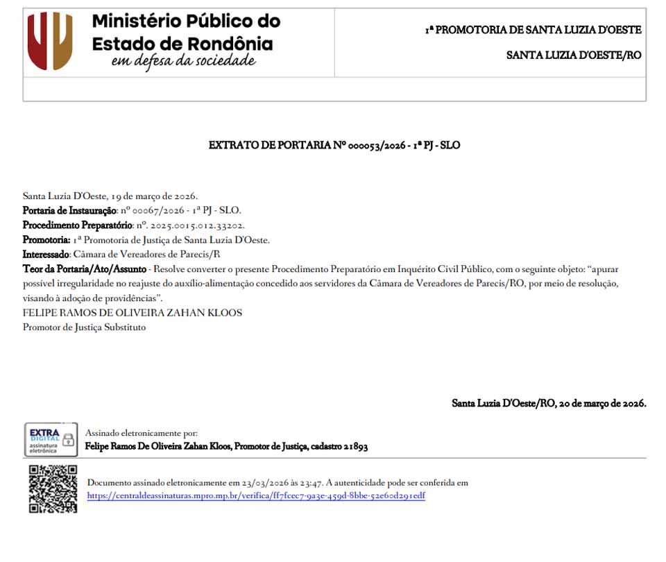 PORTO VELHO, RO - O Ministério Público do Estado de Rondônia, por meio da 1ª Promotoria de Justiça de Santa Luzia d’Oeste, instaurou inquérito civil público para apurar possível irregularidade no reajuste do auxílio-alimentação concedido aos servidores da Câmara de Vereadores de Parecis. A medida consta no extrato de portaria nº 000053/2026, referente à 1ª PJ-SLO, datado de 19 de março de 2026, no qual é formalizada a conversão de um procedimento preparatório em investigação mais aprofundada.