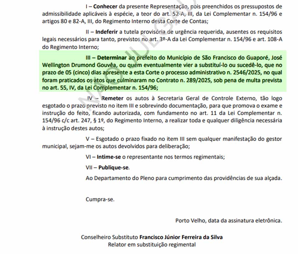 Apesar do indeferimento da medida cautelar, a decisão determinou a adoção de providências para instrução do processo. Entre elas, foi estabelecido que o prefeito de São Francisco do Guaporé, José Wellington Drumond Gouvêa, ou quem eventualmente o substitua ou suceda no cargo, apresente no prazo de cinco dias o processo administrativo nº 2546/2025, no qual foram praticados os atos que culminaram na celebração do Contrato Administrativo nº 289/2025. A decisão prevê que o não cumprimento da determinação pode resultar na aplicação de multa prevista no artigo 55, inciso IV, da Lei Complementar Estadual nº 154/1996.