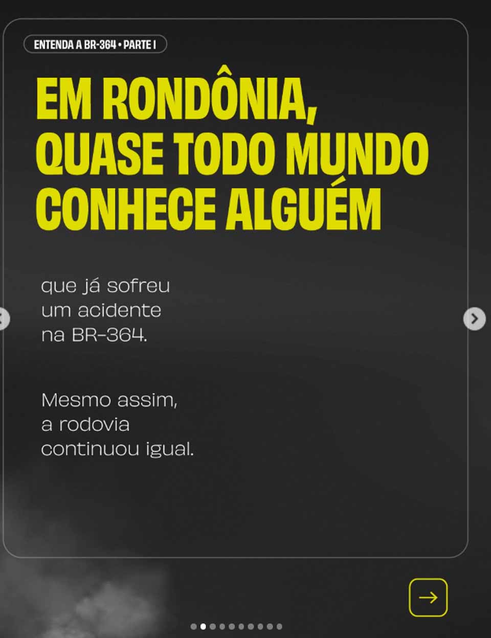 A abertura do conteúdo é marcada por uma afirmação em letras garrafais sobre fundo escuro: "A BR-364 sempre matou. E por décadas, ninguém fez nada." Na sequência, o senador amplia o contexto ao afirmar que, em Rondônia, "quase todo mundo conhece alguém que já sofreu um acidente na BR-364", acrescentando que, apesar disso, "a rodovia continuou igual".