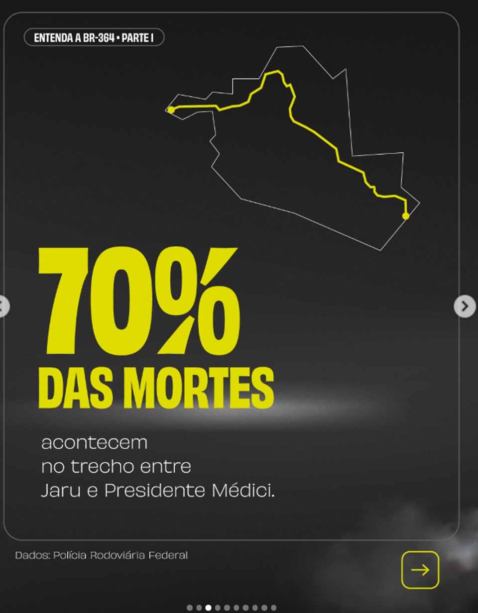 Com base em dados atribuídos à Polícia Rodoviária Federal, o material informa que cerca de 70% das mortes registradas na BR-364 ocorrem no trecho entre os municípios de Jaru e Presidente Médici. A informação é apresentada junto a um mapa estilizado do estado, com o segmento destacado, indicando a concentração de ocorrências fatais nesse ponto da rodovia.