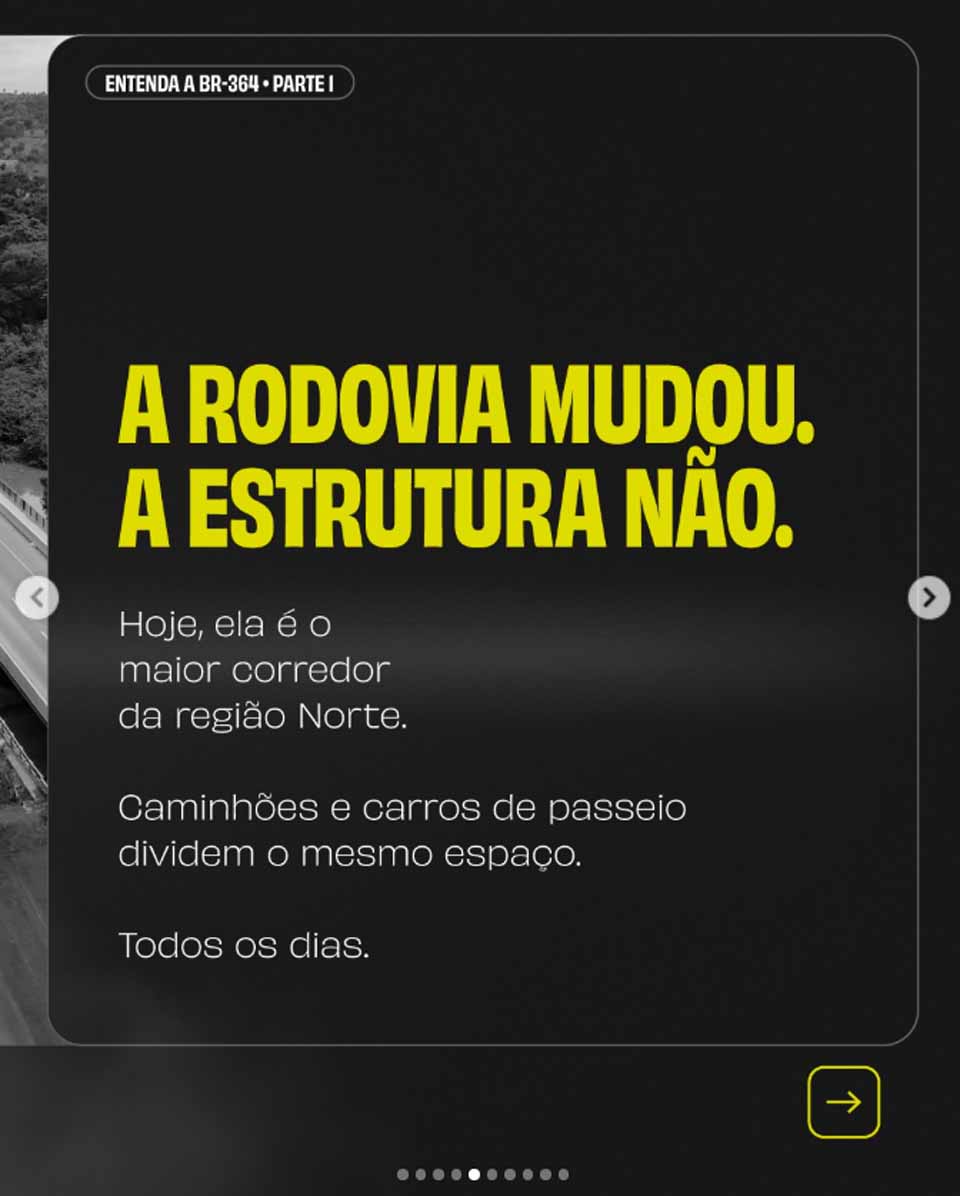 Ao abordar as causas dos acidentes, o conteúdo relaciona fatores como pista simples, tráfego intenso de veículos pesados, ausência de faixas adequadas para ultrapassagem e falta de estrutura de atendimento emergencial. Em outro momento, o senador afirma que "a rodovia mudou. A estrutura não", destacando que a BR-364 se consolidou como o principal corredor logístico da região Norte, onde caminhões, ônibus e veículos de passeio compartilham o mesmo espaço diariamente.