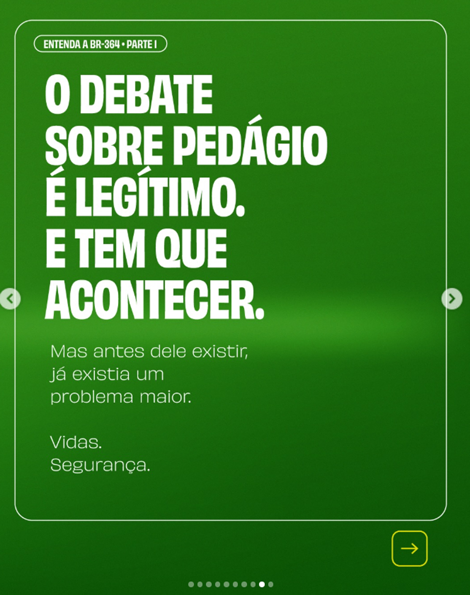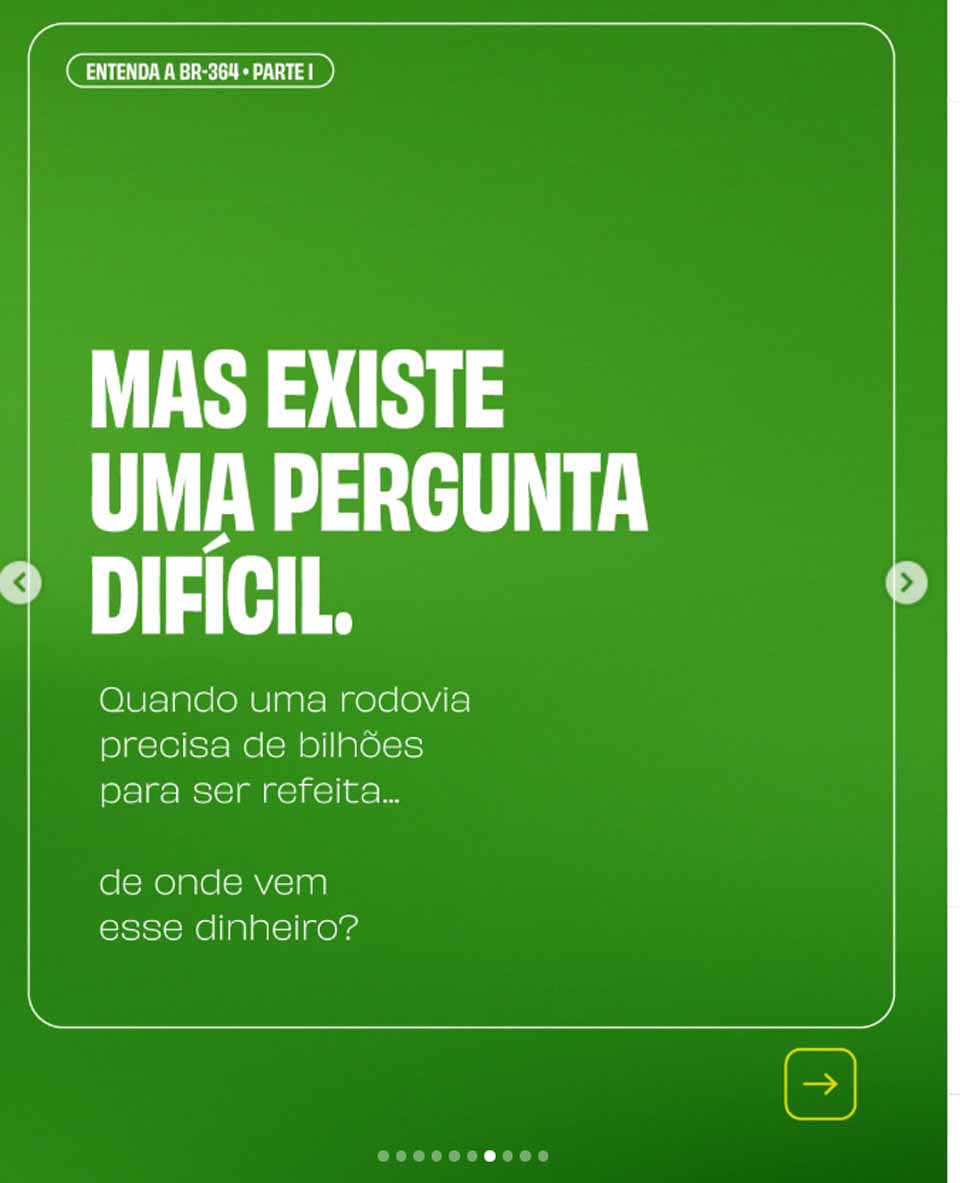 Na sequência, a publicação introduz o debate sobre financiamento das obras ao questionar: "Quando uma rodovia precisa de bilhões para ser refeita, de onde vem esse dinheiro?" A resposta apresentada indica um investimento previsto de R$ 10,2 bilhões para a BR-364. Segundo o material, esse montante contempla 108 quilômetros de duplicação, 191 quilômetros de terceira faixa, instalação de câmeras de monitoramento 24 horas e oferta de serviços de ambulância e socorro ao longo da via.