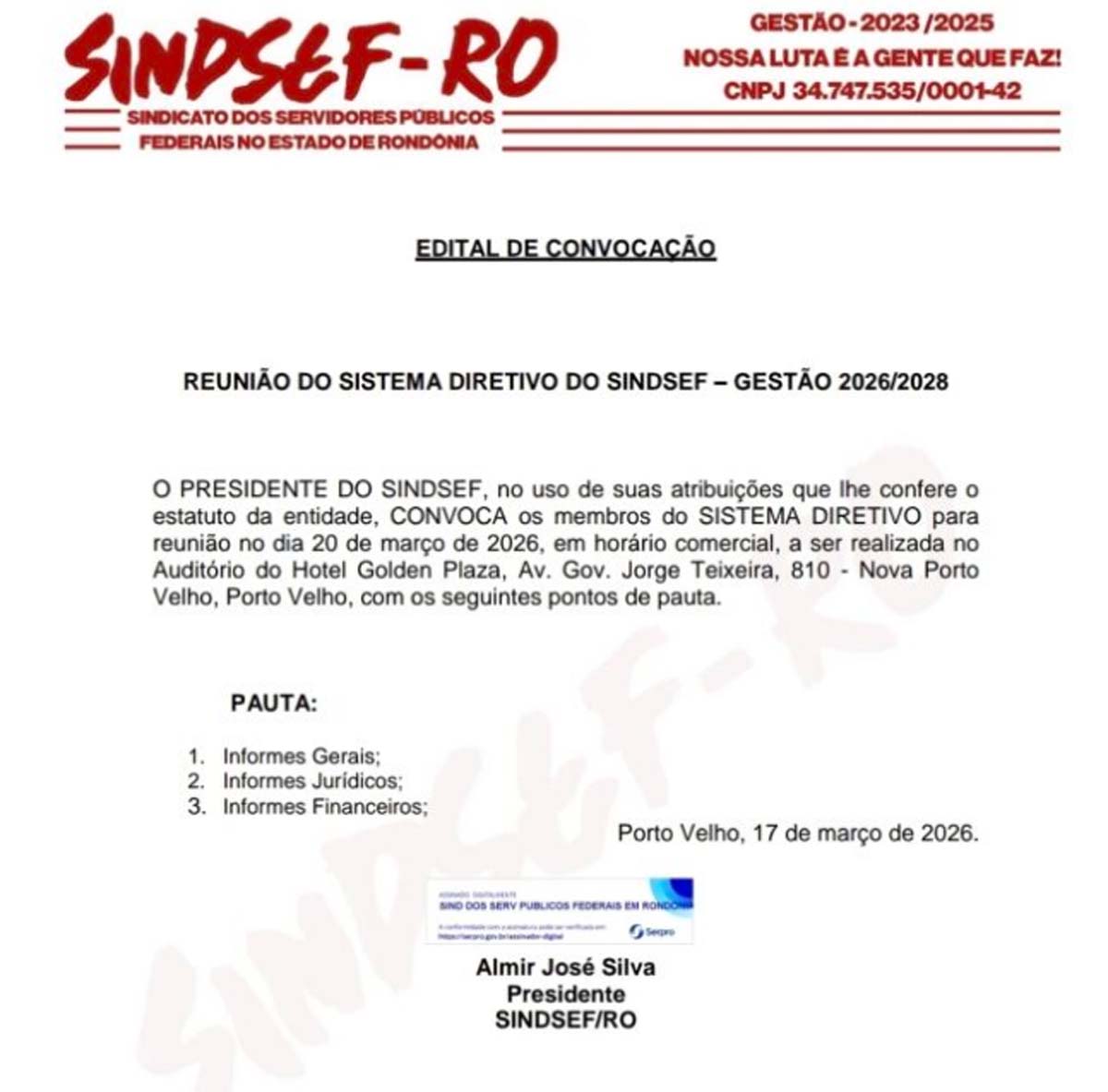 O presidente do SINDSEF-RO, no uso das suas atribuições, que lhe confre o estatuto da Entidade, convoca os membros do Sistema Diretivo, para reunião no próximo dia 20 de março, para tratar das seguintes pautas: