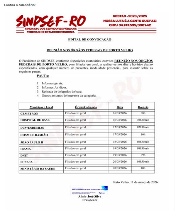A maratona de assembleias passará por locais estratégicos da saúde e da administração federal. Entre os dias 16 e 18 de março, o foco será o setor hospitalar e de vigilância, com passagens pelo CEMETRON, Hospital de Base, DCV/Endemias, Cosme e Damião e João Paulo II. Na sequência, nos dias 19 e 20, as equipes do SINDSEF-RO estarão no IBAMA, DNIT, Funasa e encerram o ciclo no Ministério da Saúde.