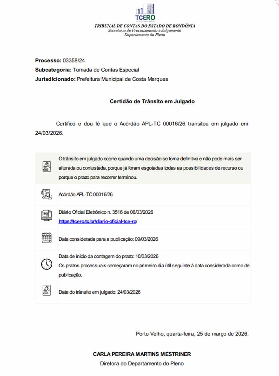PORTO VELHO, RO - O Tribunal de Contas do Estado de Rondônia tornou definitiva a decisão que julgou irregular a Tomada de Contas Especial instaurada para apurar prejuízos superiores a R$ 332 mil aos cofres públicos na execução de serviços de iluminação pública no município de Costa Marques. O acórdão APL-TC 00016/26, referente ao processo nº 03358/2024, transitou em julgado em 24 de março de 2026, encerrando a possibilidade de recurso.