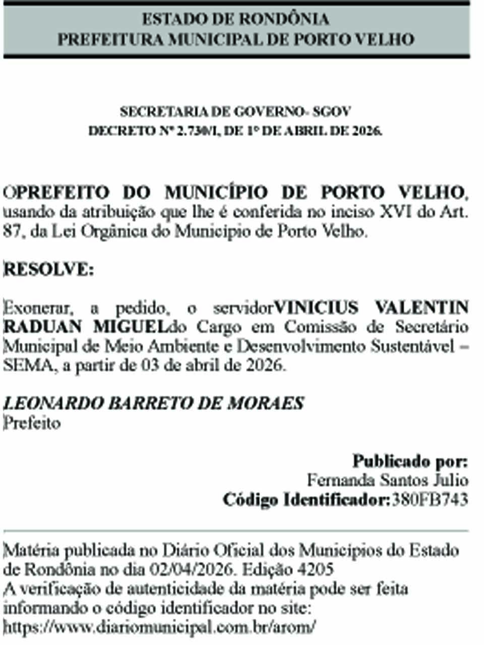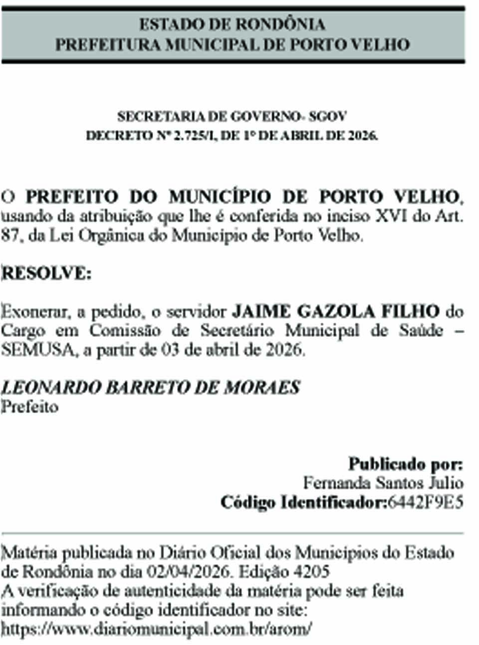 PORTO VELHO, RO - O prefeito de Porto Velho, Léo Moraes, assinou decretos que determinam a exoneração de três secretários municipais, com efeitos a partir de 3 de abril de 2026, conforme publicações no Diário Oficial dos Municípios do Estado de Rondônia. As medidas atingem as pastas da Saúde, Turismo, Esporte e Lazer, e Meio Ambiente e Desenvolvimento Sustentável, em razão do cumprimento dos prazos estabelecidos pelo calendário eleitoral.