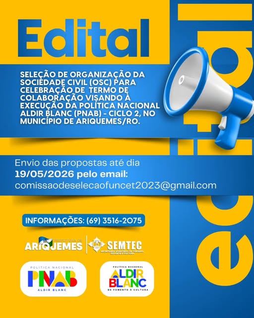 Foi aberto pela Prefeitura de Ariquemes um edital voltado à seleção de Organização da Sociedade Civil (OSC) interessada na celebração de Termo de Colaboração para execução da Política Nacional Aldir Blanc (PNAB) – Ciclo 2 no município. A iniciativa contempla a implementação de ações no setor cultural local, conforme previsto no chamamento público.