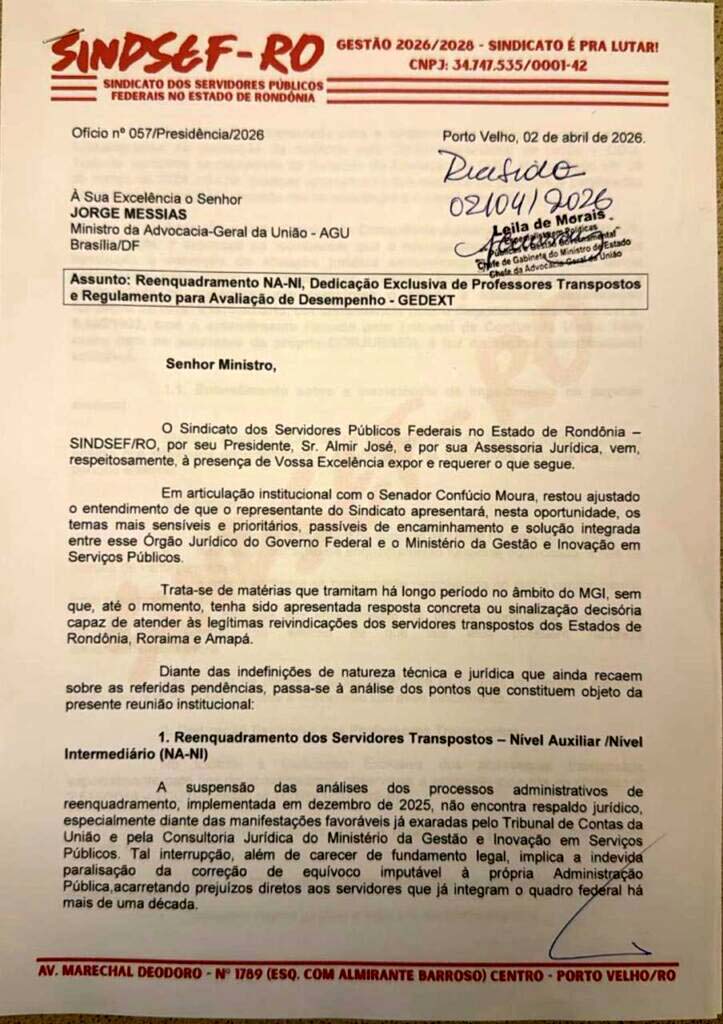 A reunião teve como principal objetivo dar encaminhamento às pautas apresentadas no Ofício nº 057/Presidência/SINDSEF/2026, protocolado pelo SINDSEF/RO junto à AGU, documento que trata de temas estruturantes e de longa tramitação administrativa, ainda pendentes de solução no âmbito do Governo Federal.